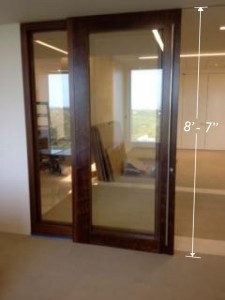 1. The standard door core is a main cause. No matter what kind of standard core a door is made from, whether paper core, foam core, SLC (Stave lumber core), particleboard, SCLS (Structure composite lumber), LVL (Laminated veneer), mineral core, mdf, cardboard, etc., etc., etc., warping is inevitable. Even a solid wood door will warp. A sliding or pivot door will have unbearable warp at only ¼ inch due to the reference next to a straight wall or door jam. This warping is even worse in a door over 8 feet because of the strength of the movement. So far, the best solutions have been to only make 7-foot high doors, or to make excuses (i.e., no or very limited warrantees) for doors over 8 feet, or to use gaskets to hide the minor warping, but these are temporary solutions that require costly maintenance and replacement and tarnish the reputations of the building trade professionals involved in the projects. As such, most doors usually do not have warranty protection against the inevitable warping. Even with SCLC (Structure composite lumber core) and LVL (Laminated veneer), commonly used in high end large door will not remain true flat due to the wood fiber constantly moving.
