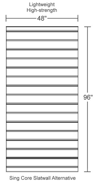 This full-sized Sing Core slat wall panel is 9 ft. tall, 4 ft. wide, and 2 in. thick with 6 in. slat wall slots. Each slat wall panel features slats on both sides of the wall without compromising the Sing Core panel’s strength.
